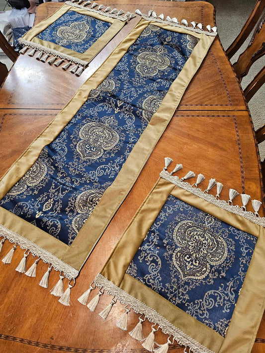 Two Pcs Fancy Navy Blue & Dark Beige End Table Covers With Tassels