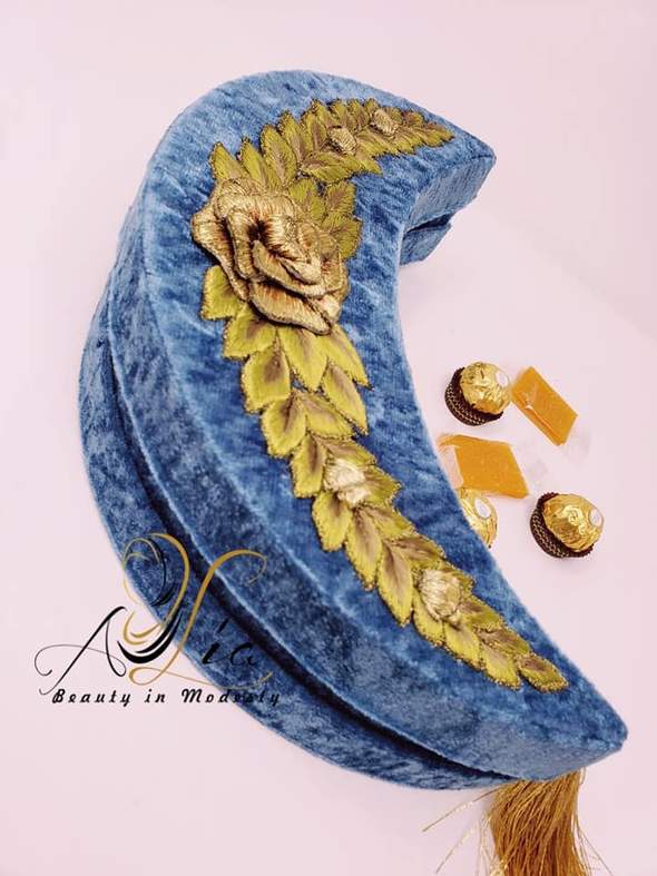 Guest Traditional Serving Container. This elegant cresent box is made of Velvet fabric with golden flowers design.