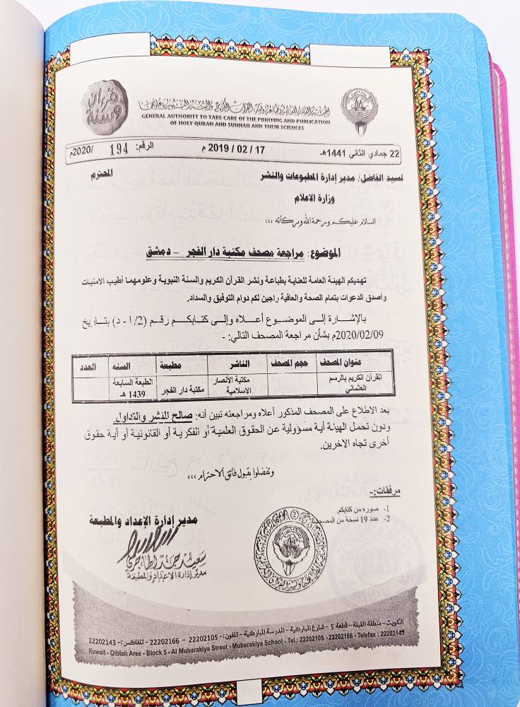 ِThis Holy Quran was audited by Management of Fatwa & Religious Teaching in Syria, Department of Islamic research of Egypt, Saudi Arabia & Jordan